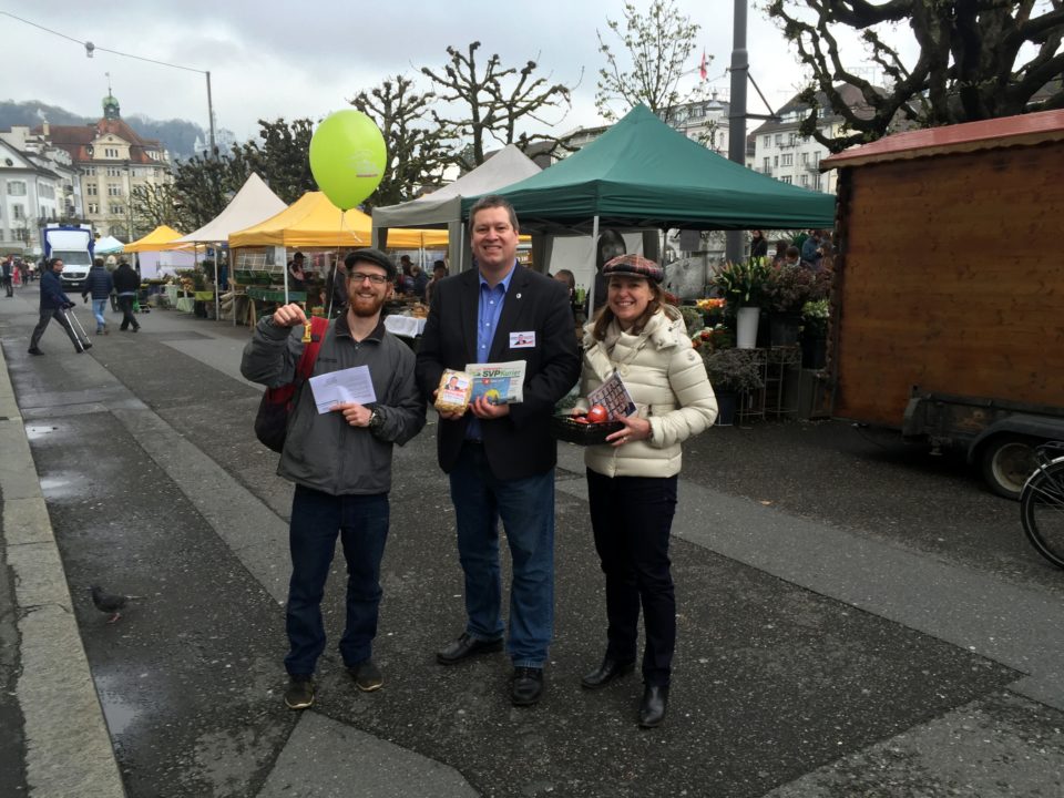 Am Samstag, 9. April, führten verschiedene Parteien in der Stadt Luzern Wahlaktionen durch. Die FDP hatte eine bewilligte Standaktion beim Theaterplatz, die SVP eine ebenfalls bewilligte Standaktion bei der Hauptpost auf dem Bahnhofplatz und die Grünen waren zu zweit mobil unterwegs und sammelten Unterschriften für eine Initiative. Die FDP verteilte an ihrem Stand Äpfel mit FDP-Klebern, die Grünen 12.5-Gramm-Mini-Toblerone und die SVP 200-Gramm-Teigwarenpakete mit Werbeaufdruck. Im Laufe des Morgens kam eine Mitarbeiterin von Stadtraum und Veranstaltungen in Begleitung von zwei Polizisten vorbei und verlangte, dass die Verteilung der sogenannten Give-Aways sofort gestoppt würde, da dies den Wochenmarkt konkurrenzieren würde. Die beiden Grünen wurden zudem von der Polizei darauf hingewiesen, dass mobile Sammelaktionen nur als Einzelperson gestattet seien, aber nicht zu zweit. Worauf sich diese Aussage stützt und wie gross die räumliche Distanz in Metern zwischen den beiden Personen hätte sein müssen, damit sie als Einzelpersonen gelten, wurde leider nicht erwähnt.